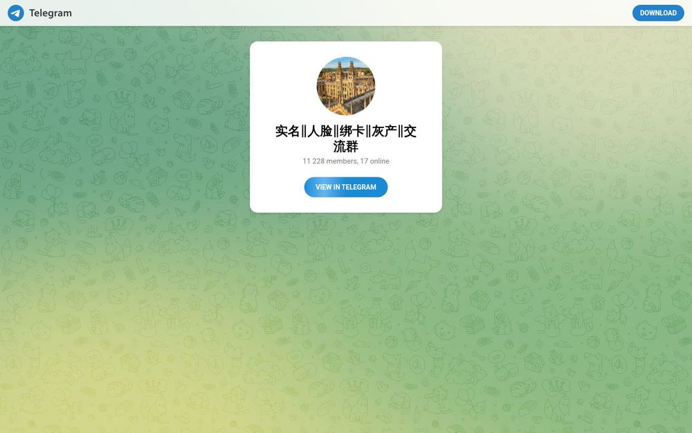 这是一个标注为 实名‖人脸‖绑卡‖灰产‖交流群 的 Telegram 群组(用户名:abcvip163),页面显示该群组有约 11,228 名成员,当前 17 人在线。页面本身为 Telegram 的入口页面,主要用途为引导已安装 Telegram 的用户直接查看并加入该群组。群名明显包含“实名”“人脸”“绑卡”“灰产”等敏感词汇,提示其讨论内容可能涉及法律或合规风险较高的话题。