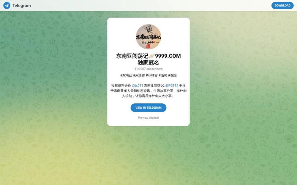 “东南亚闯荡记”是一个面向华语受众、聚焦东南亚地区的 Telegram 频道,由 9999.COM 独家冠名。频道定位为当地新闻速报、生活故事分享和海外华人互助平台,覆盖柬埔寨、菲律宾、缅甸、泰国等国家的社会动态与民生话题,订阅者规模庞大,信息传播及时且接地气。