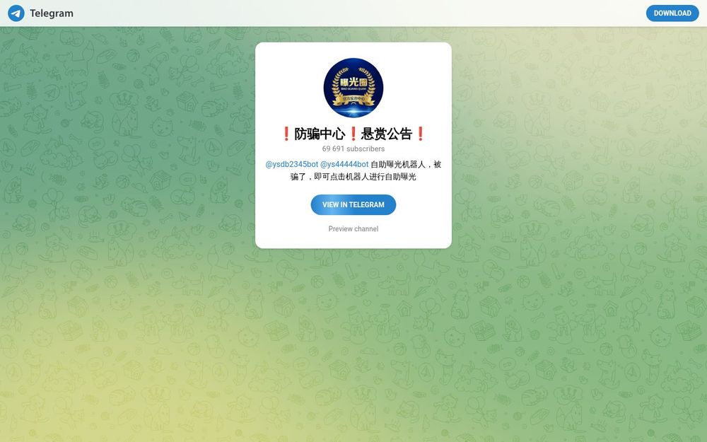 ❗️防骗中心❗️悬赏公告❗️ 是一个依托 Telegram 社区的反诈骗信息发布平台,旨在汇集受害者自助曝光、发布悬赏线索、传播防骗知识并提供实时预警。频道已吸引大量订阅者(约69,691人),并通过专用机器人接收用户提交的诈骗线索,便于快速公开与传播,形成社会监督与防范合力。