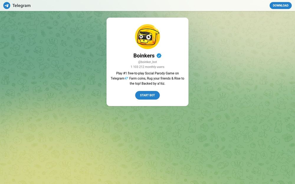 Boinkers 是一个基于 Telegram 机器人的社交恶搞(parody)游戏,主打轻量化、社群驱动的玩法体验。用户可在聊天环境中直接与机器人交互,进行“农场”类的代币经营、对好友施放恶搞行为(如“rug”机制)并争夺排行榜名次。项目得到了 a16z 的投资背书,并拥有百万级别的月活跃用户,体现出强烈的社交传播与用户粘性特征。
