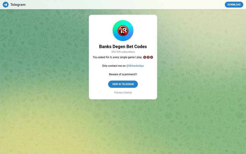 Banks Degen Bet Codes 是一个在 Telegram 平台上运作的频道,面向关注作者亲自参与的游戏和投注内容的用户。频道以分享每场游戏的代码、体验与下注提示为主,明确标注为成人内容(🔞),并公开订阅人数以供参考。平台强调仅通过指定的联系方式 @Mrbankstips 进行联系,同时不断提醒用户注意市场中的诈骗风险。