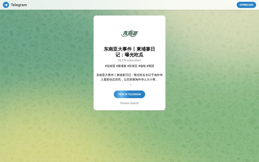东南亚大事件丨柬埔寨日记:曝光吃瓜 是一个在 Telegram 平台上运营的中文资讯频道,聚焦东南亚地区的社会新闻与华人社区动态。频道以本地化的视角和民间爆料为切入点,及时整合并发布关于柬埔寨、菲律宾、缅甸和泰国等国的社会事件、民生话题与热点讨论,旨在为海外华人提供快速、实用的信息渠道。