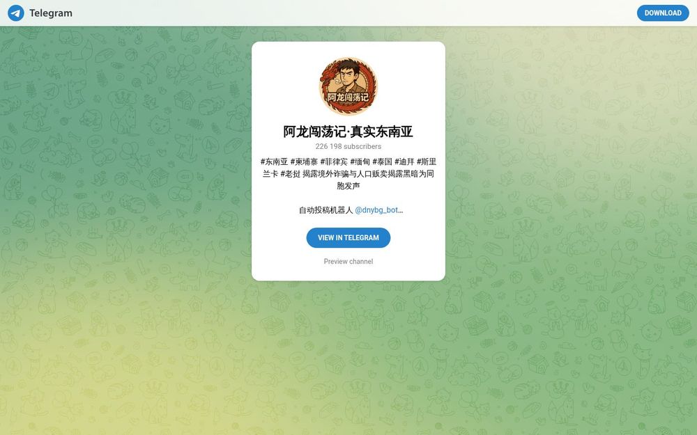阿龙闯荡记·真实东南亚是一个基于Telegram的资讯与揭露频道,主要关注东南亚地区及周边国家的治安动态、诈骗案件与人口贩卖问题。该频道以实地揭露、受害者口述和案件追踪为主要内容形式,旨在通过信息传播提高公众警觉,并为在外的同胞提供帮助与声音。频道有固定的自动投稿机制,并在抖音、YouTube等平台同步发布相关内容。