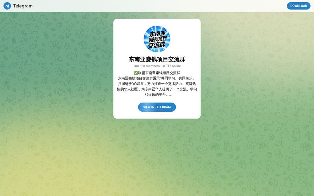 东南亚赚钱项目交流群是一个以东南亚华人为核心的Telegram社群,聚焦各类线上与线下的赚钱项目分享、资源对接与经验交流。群组声称拥有十万级别的成员规模,实时在线人数也较多,旨在通过社群力量帮助成员发现机会、规避风险并提升收益能力。社群强调“共同学习、共同娱乐、共同进步”的价值观,并对不良行为实行严格管理。