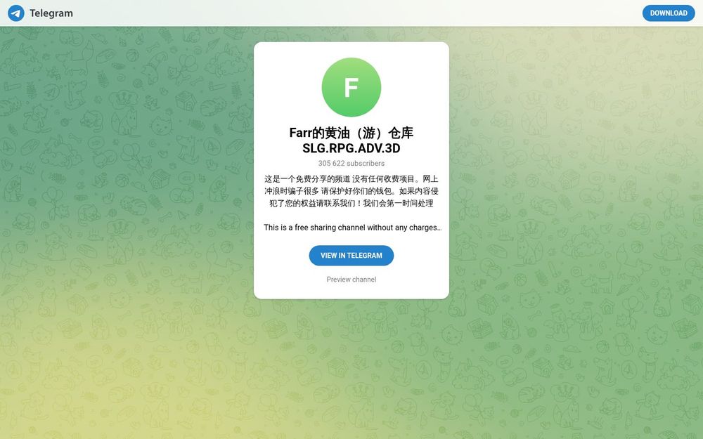 Farr的黄油(游)仓库SLG.RPG.ADV.3D 是一个面向游戏爱好者的 Telegram 频道,主要分享与汇总 SLG(策略类)、RPG(角色扮演)、ADV(冒险/视觉小说) 以及 3D 游戏 相关的资源、信息与下载链接。频道以免费分享为宗旨,强调无任何收费项目,并对网络诈骗、版权问题等进行提示与处理。该频道对希望通过 Telegram 快速获取游戏资源、补丁、汉化、攻略和预览的用户具有较高的实用价值。