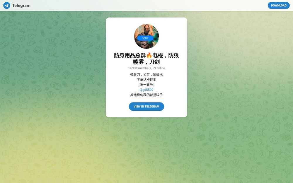 防身用品总群是一个以 Telegram 为平台的防身器具社群与交易渠道,主要面向关注个人安全与自卫装备的用户。频道常发布电棍、防狼喷雾、弹簧刀、匕首等商品信息,配有图片展示,并提示会员通过群主指定账号下单以防止被骗。该群组号称有约 14,931 名成员,具有一定的流量与关注度。