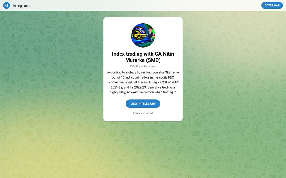 Index trading 是由 CA Nitin Murarka(SMC)在 Telegram 上运营的专业频道,面向关注股指期货与期权(F&O)市场的交易者与投资者。频道汇集市场观点、交易思路、实战提示与教育性内容,旨在为关注衍生品交易的人群提供信息参考与风险提醒。页面同时引用 SEBI 的研究数据,强调衍生品交易存在较高亏损风险,提醒用户谨慎决策并重视风险管理。