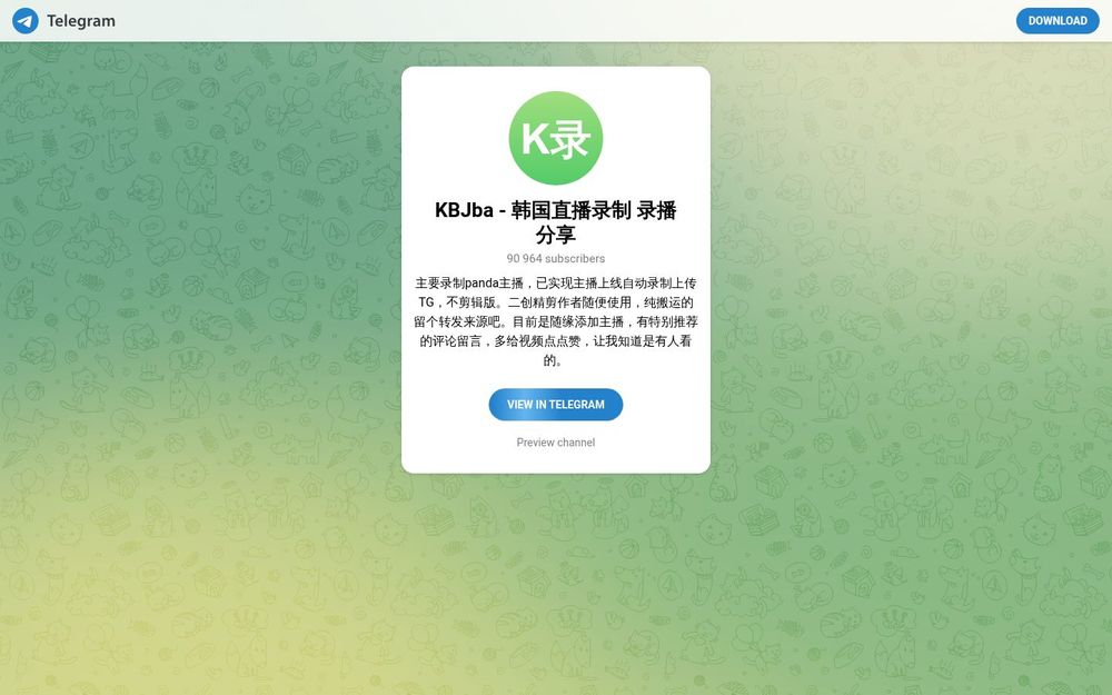KBJba 是一个专注于韩国直播录制与录播分享的 Telegram 频道,订阅者以喜欢在线观看和二次创作韩国主播内容的用户为主。该频道的内容以“panda”主播为主要录制对象,提供主播上线时的自动录制并上传到 Telegram 的未剪辑版本,方便用户获取原始完整录播。频道通过订阅和互动(留言、点赞)来决定和扩展收录的主播名单,运营较为灵活和社区驱动。
