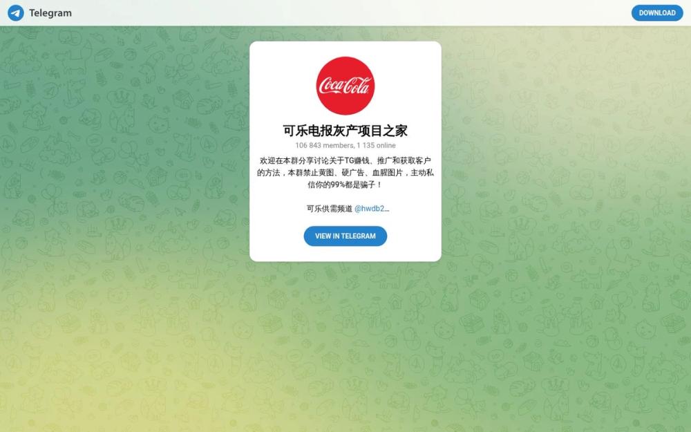 可乐电报灰产项目之家(简称“可乐”)是一个基于 Telegram 的大型交流社区,侧重于在 TG 平台上的变现、流量推广和客户获取等实操内容。该群现有 106,843 名成员、1,135 人在线,配套有供需频道(@hwdb2)和官方大群(@vip1555),为成员提供信息共享、资源对接与合作机会。