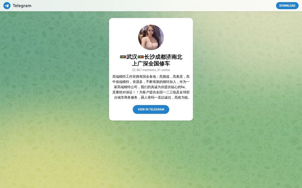 丽人密码是一家面向全国服务的高端模特工作室与商务服务平台,在Telegram频道中以推广模特资源和提供商务约拍、陪同服务为主。频道自称拥有大量高颜值、高素质的模特资源,覆盖一二三线城市以及部分海外城市,旨在为需要拍摄、商务活动或私人陪同的客户提供便捷可靠的对接渠道。频道强调诚信与高效,宣称为上万客户提供过服务,并持续补充新的模特资源。