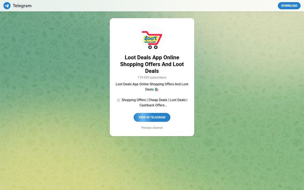 Loot Deals 应用(Loot Deals App Online Shopping Offers And Loot Deals)是以 Telegram 频道为载体的购物优惠与折扣信息聚合平台,频道订阅量较大(约 179,035 名订阅者),旨在为用户推送最新的网购促销、廉价好物和返现活动。频道同时提供 App 下载链接,方便用户在移动端查看和使用精选优惠。