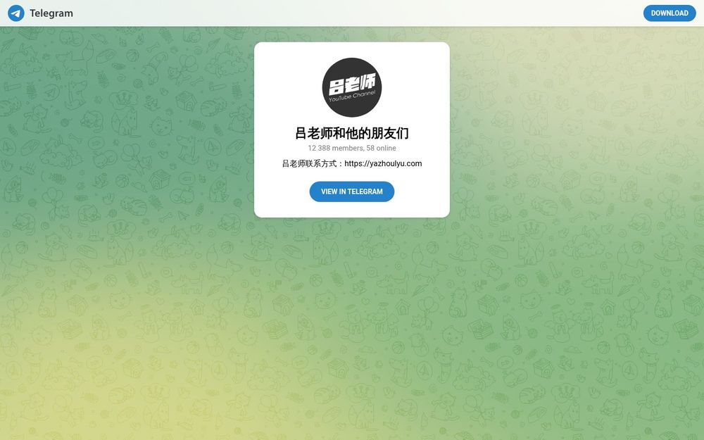 “吕老师和他的朋友们”是一个以“吕老师”为核心运作的 Telegram 社群/频道(用户名:lyuyazhou)。页面显示该频道拥有 12,388 名成员、58 人在线,并在简介中提供了吕老师的对外联系方式(https://yazhoulyu.com)。该频道面向使用 Telegram 的用户,提供快速加入和浏览的便捷入口,适合希望参与讨论、获取信息或联系群主的用户。
