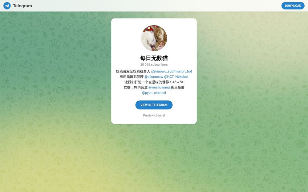 每日无数猫适合各类猫咪爱好者:想看治愈萌图的人、喜欢分享自家猫咪瞬间的人、以及希望加入活跃宠物社群的人。频道运作成熟、互动渠道明确、与其他宠物频道有良好联动,是一个可靠而温暖的线上猫咪社区。欢迎使用 Telegram 的用户直接加入,体验“让我们打造一个全是猫的世界”的社群氛围。