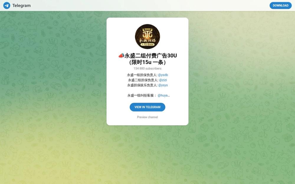 永盛二组是一个基于 Telegram 的中文频道与服务体系,侧重于付费广告投放、供需对接与担保交易。频道宣称广告价格为“付费广告30U(限时15U一条)”,并拥有超过15万名订阅者,适合希望在海外社交平台进行快速曝光的个体与商家。频道内分工明确,设置了担保负责人、纠纷客服与广告客服,提供较完整的交易与售后链路。