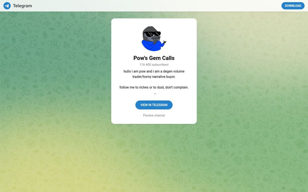 Pow's Gem Calls 是一个以加密资产短线“宝石”选币和交易提示为主的 Telegram 频道,由自称“Pow”的去中心化交易者运营。频道强调成交量驱动和基于市场叙事的买入思路,语气直率、富有个性,宣称“follow me to riches or to dust”,吸引了超过 116,400 名订阅者关注。主页提供频道预览与加入链接,也列出创作者的 Twitter 与商务联系方式。