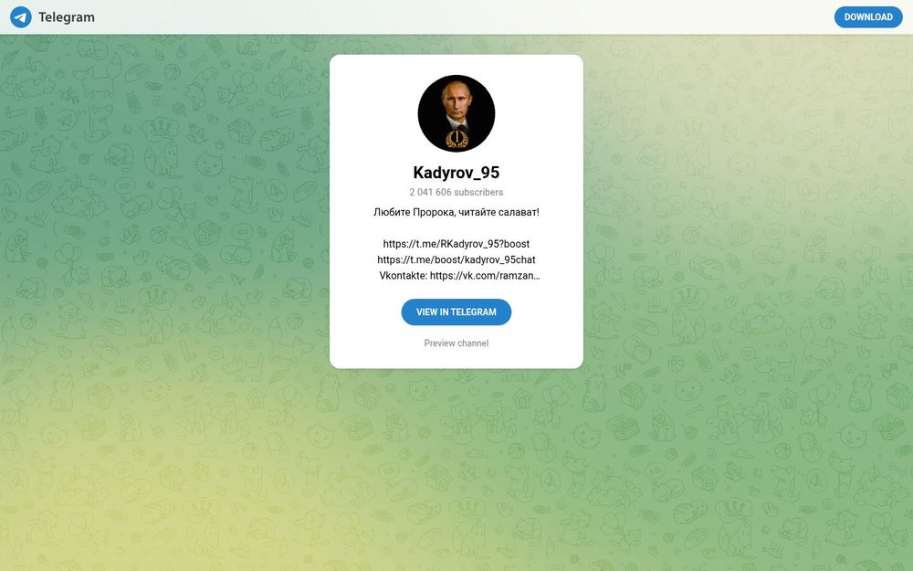 Kadyrov_95(在 Telegram 上以 RKadyrov_95 标识出现)是一个面向公众的 Telegram 频道,订阅者数量超过 2,041,606 人。频道内容以俄语为主,既有宗教性表述和祈祷语句,也发布与频道主体相关的个人声明、政治信息和多媒体素材。页面同时提供了加入链接、频道预览以及与 VKontakte、Twitter 等外部社交平台的关联链接,便于扩展传播与跨平台关注。