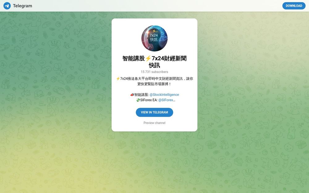 智能講股⚡️7x24財經新聞快訊是一個以中文為主、提供全天候即時財經新聞推送的 Telegram 頻道,旨在讓使用者能在最短時間內獲取市場重要資訊。頻道整合多個來源並快速轉發要點,並鏈接到相關的主帳號與討論社群,形成資訊接收與互動的閉環。