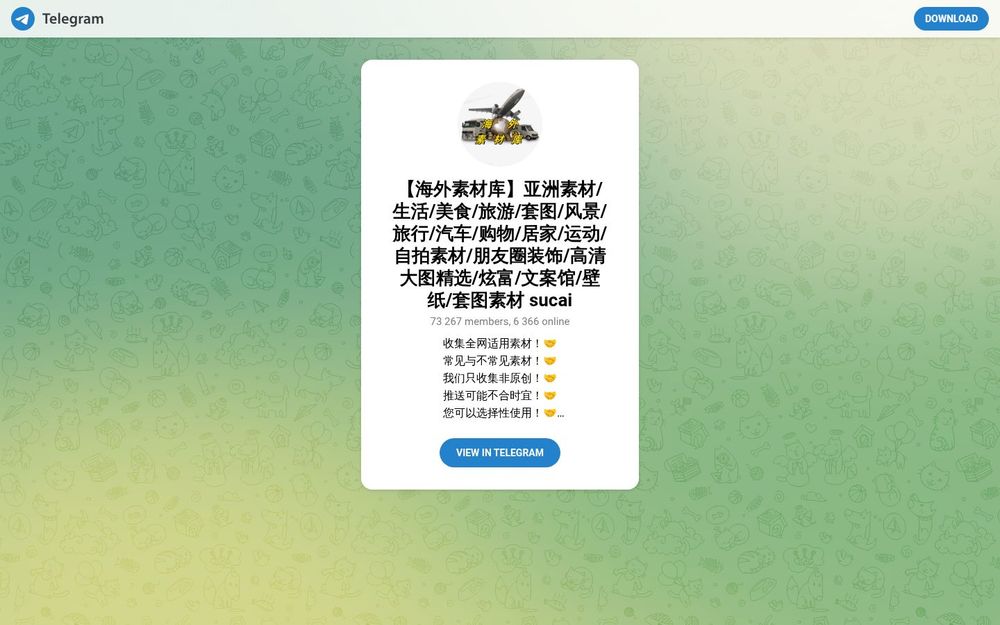 sucai(【海外素材库】)是一个基于 Telegram 的素材分享频道,定位为“收集全网适用素材”的资源库。频道主要聚合非原创的高清图片与套图,分类覆盖面广,包括亚洲素材、生活、美食、旅游、风景、旅行、豪车、购物、居家、运动、自拍、壁纸等,适合需要大量视觉素材的个人用户、社媒运营与内容创作者使用。频道强调分类清晰与便捷检索,便于快速找到所需图片与风格素材。