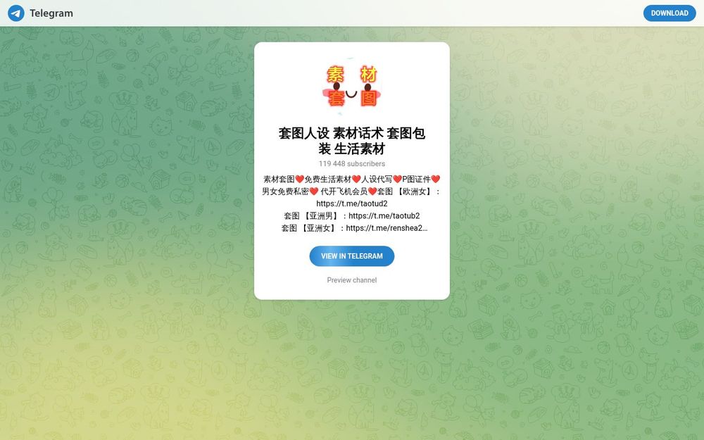 “套图人设 素材话术 套图包装 生活素材”是一个基于Telegram的素材与话术分发频道,面向需要套图、人设包装、话术代写及生活素材的用户。频道通过主频道与多个细分子频道(如欧洲女、亚洲男、亚洲女、欧洲男及话术区)进行分类管理,同时提供双向机器人与客服账号,方便用户浏览、订购与咨询。其内容涵盖免费资源和付费服务两类,强调快速获取与便捷联系。