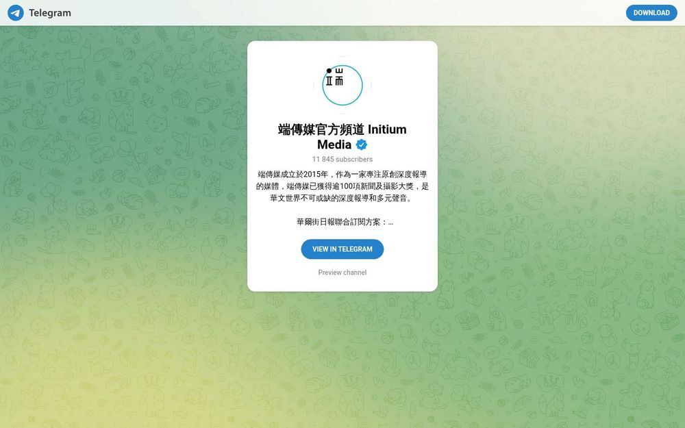 端傳媒(Initium Media)成立於2015年,是一家以原創深度報導為核心的華文媒體機構。官方Telegram頻道“端傳媒官方頻道 Initium Media”作為其數位宣傳與內容分發的重要管道,用於推送最新文章、專題報導與多媒體內容,並提供訂閱與會員方案的資訊。官方頻道已累積數萬名訂閱者,並以其專業性與獲獎紀錄在華文新聞圈具有一定影響力。