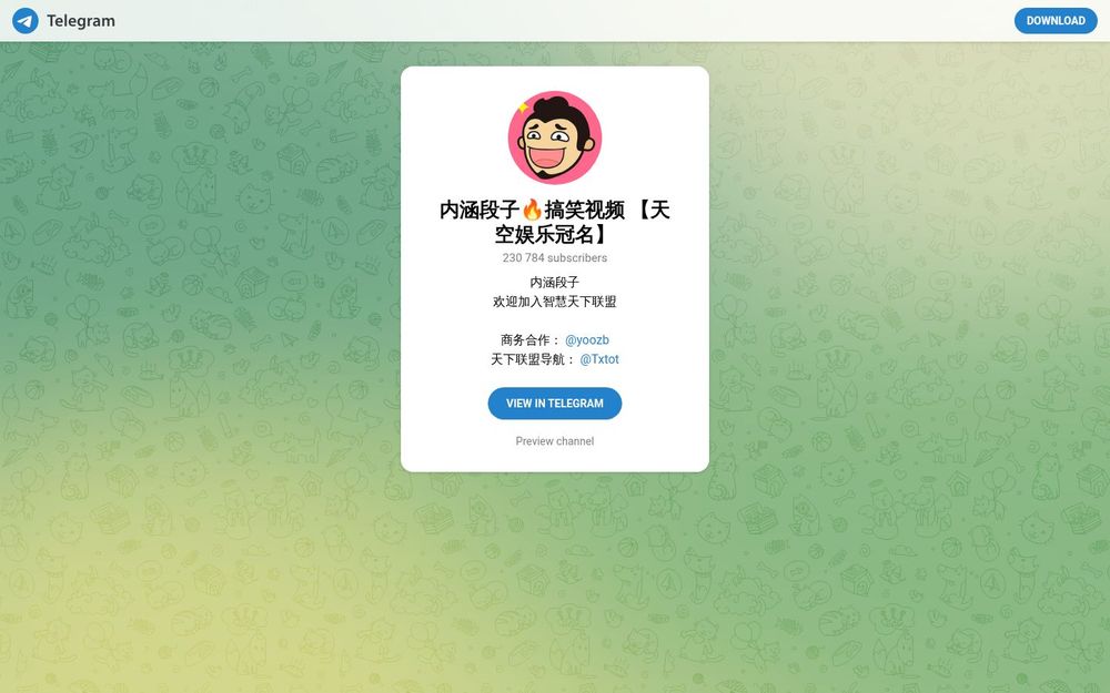 内涵段子🔥搞笑视频(由天空娱乐冠名)是一个专注于中文短视频与段子分享的 Telegram 频道,目标为提供轻松幽默的内容以满足用户碎片化娱乐需求。频道定位清晰,内容风格以搞笑、内涵段子、短视频剪辑为主,适合在通勤、休闲或社交场景中观看。当前频道订阅用户规模较大(约 230,784 人),同时与“智慧天下联盟”组织保持联动,提供统一的导航与商业合作渠道。