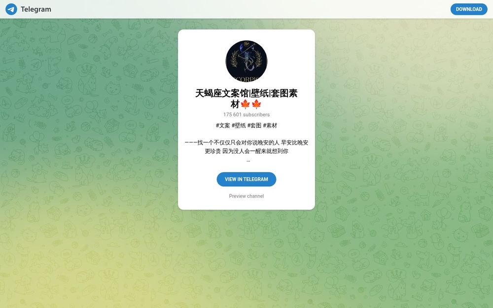天蝎座文案馆是一个以文案与视觉素材为核心的 Telegram 频道,主要面向喜欢精致文案、情感语句与美观壁纸的用户群体。频道长期更新壁纸、套图和配套文案,内容风格偏向情感、个性与审美表达,订阅人数超过 175,000,具备稳定的受众基础与传播力。