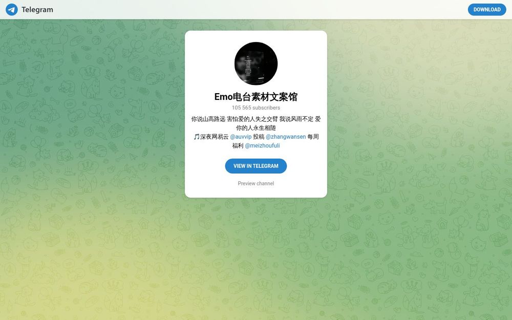 Emo电台素材文案馆是一个专注于“情绪化音乐+文案素材”分享的 Telegram 频道,面向需要情感氛围素材的内容创作者和爱好者。频道通过整理网易云投稿、作者投稿及频道运营方的定期更新,为用户提供可直接使用的音乐片段、配图和文案句子,帮助快速搭建短视频背景、情感故事配乐或社媒文案框架。该频道订阅人数众多,具有明显的社区粘性与素材积累特点。