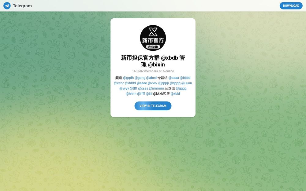 新币担保群(Telegram 账号:@xbdb)是一个面向新代币关注者与交易者的社区聚合平台,由管理员 @bixin 负责管理。页面显示群成员规模较大(约148,582名成员,线上约516人),并列出多个关联频道、专群与公群,此外提供专用客服账号 @xbkf 以便用户咨询。该群通过 Telegram 平台运作,用户需使用 Telegram 客户端(通过“View in Telegram”或 tg:// 链接)进行查看与加入。