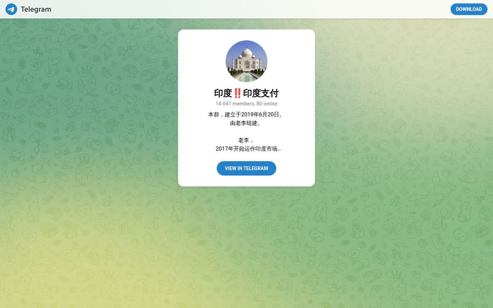 “印度支付”是一个基于Telegram的中文社群,创建于2019年6月20日,由有多年印度市场经验的老李发起。社群聚集了数以万计的关注印度市场与支付生态的中文从业者与爱好者,旨在为成员提供关于印度支付体系、市场准入、业务落地以及本地资源对接的实战交流场所。群内信息以实务为导向,强调经验分享、问题求解与合作对接。