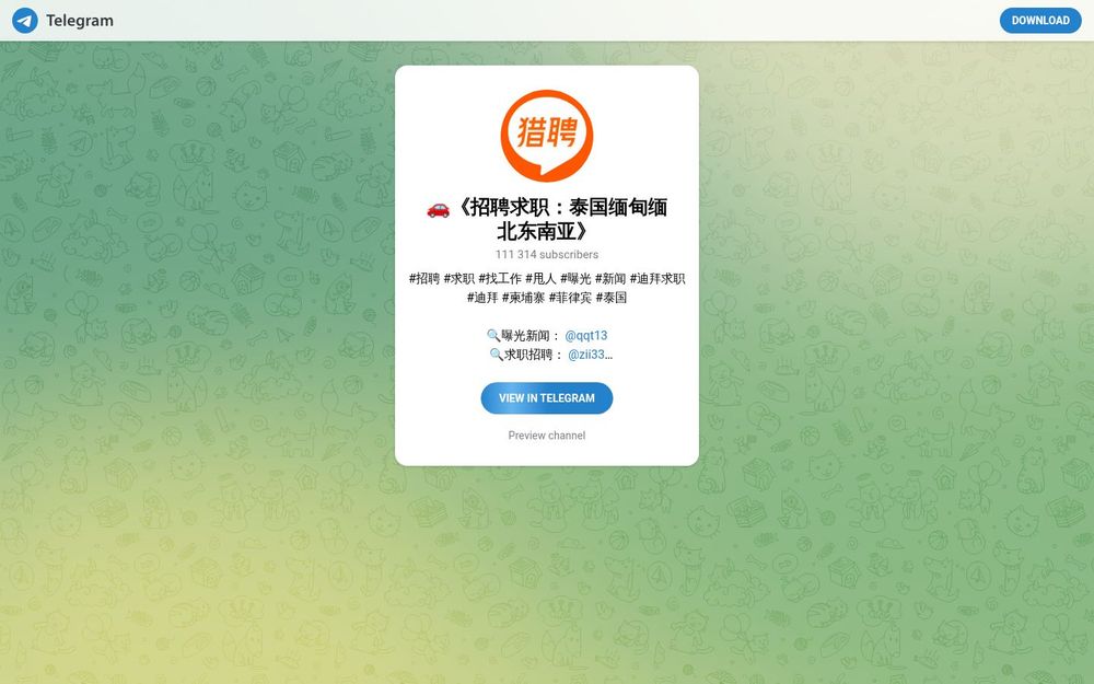 招聘求职:泰国缅甸缅北东南亚 是一个以 Telegram 为载体的中文社区频道,主要面向在泰国、缅甸、缅北及周边东南亚地区寻找工作机会或关注当地新闻、曝光信息的用户。频道通过发布招聘信息、求职贴、曝光与新闻内容,帮助求职者与雇主建立联系,同时提供广告投放和账号支持渠道,成为区域性信息聚合与交流平台。